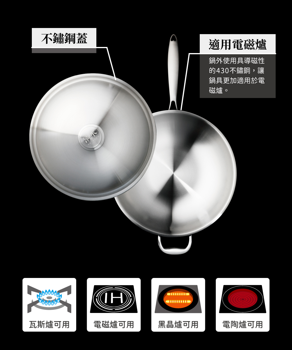 ※外層採用430導磁性不鏽鋼,讓鍋具除了適用於瓦斯爐外,也加強了於電磁爐上的導熱性能。