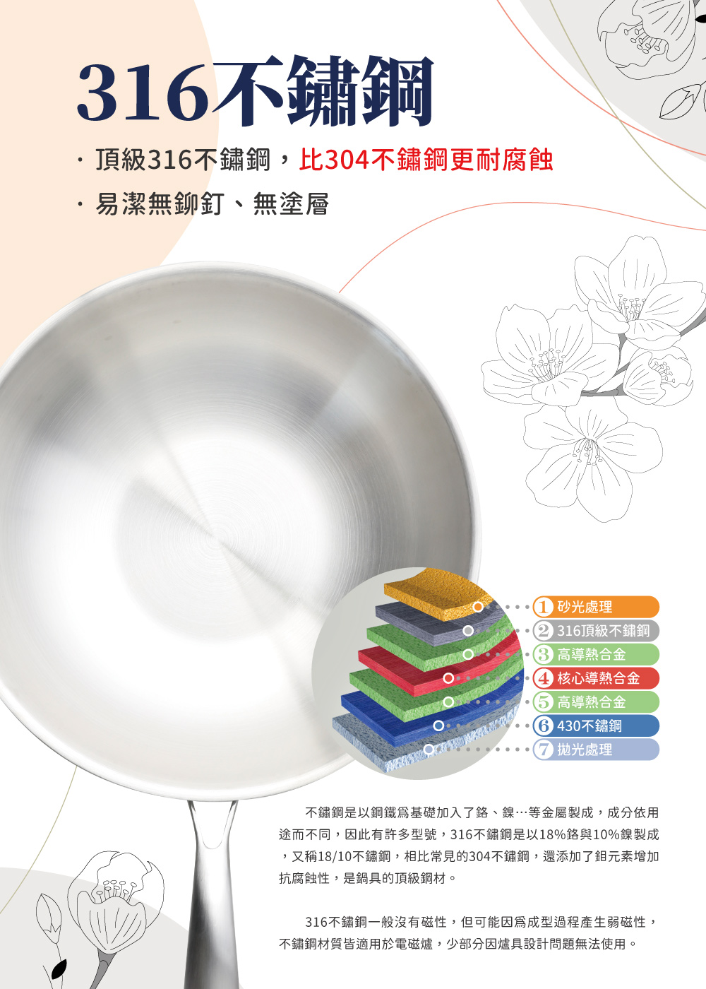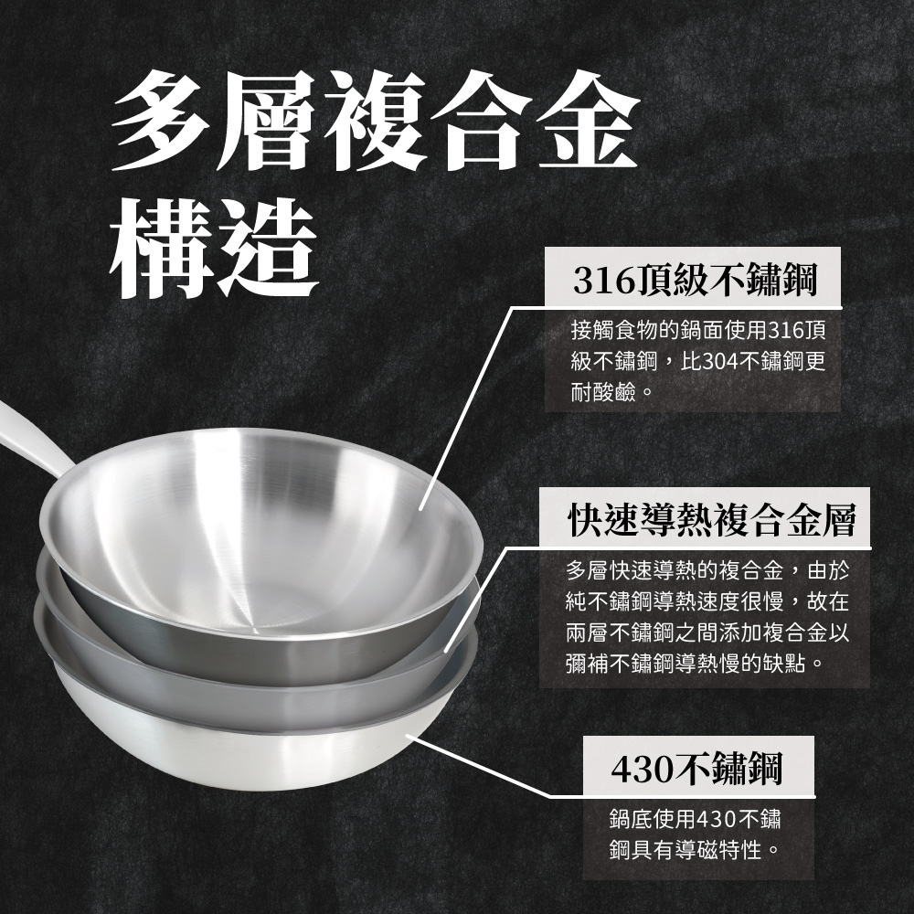 | ◆鍋身材質:內層採用316不鏽鋼,外層採用430導磁性不鏽鋼。 |