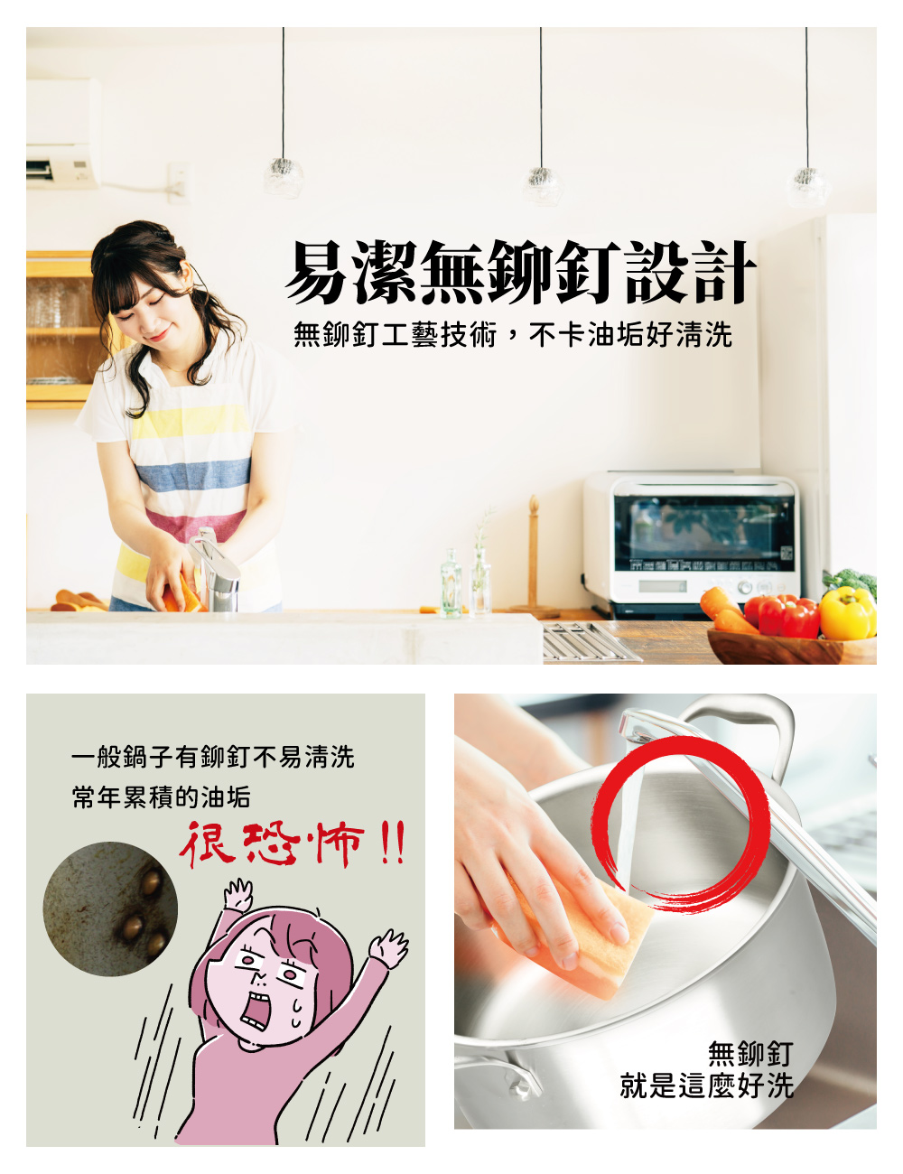 ※鍋內無鉚釘設計,不卡油垢好清洗。