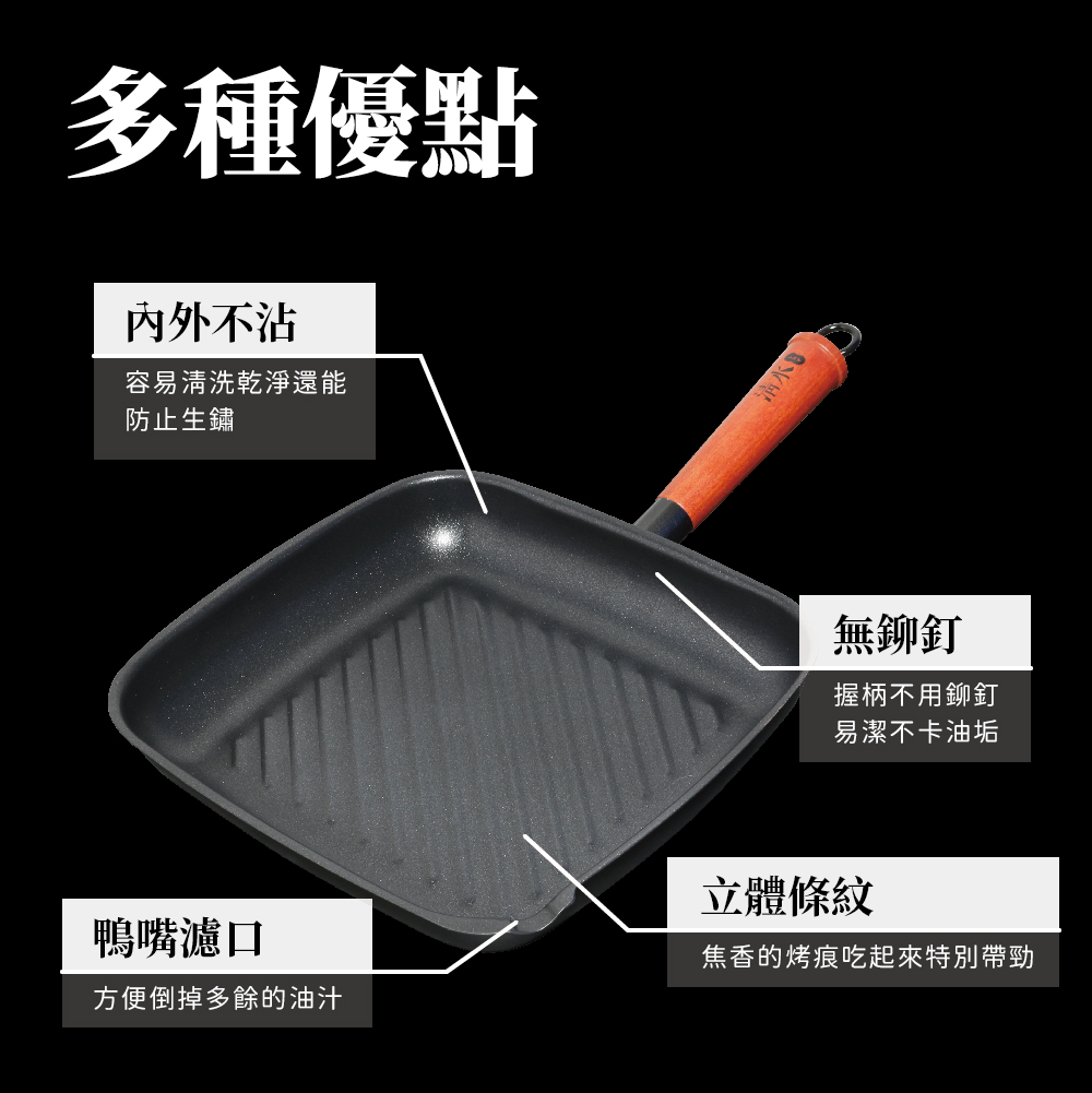※可煎牛排、烤肉,立體條紋煎出美味烤痕。