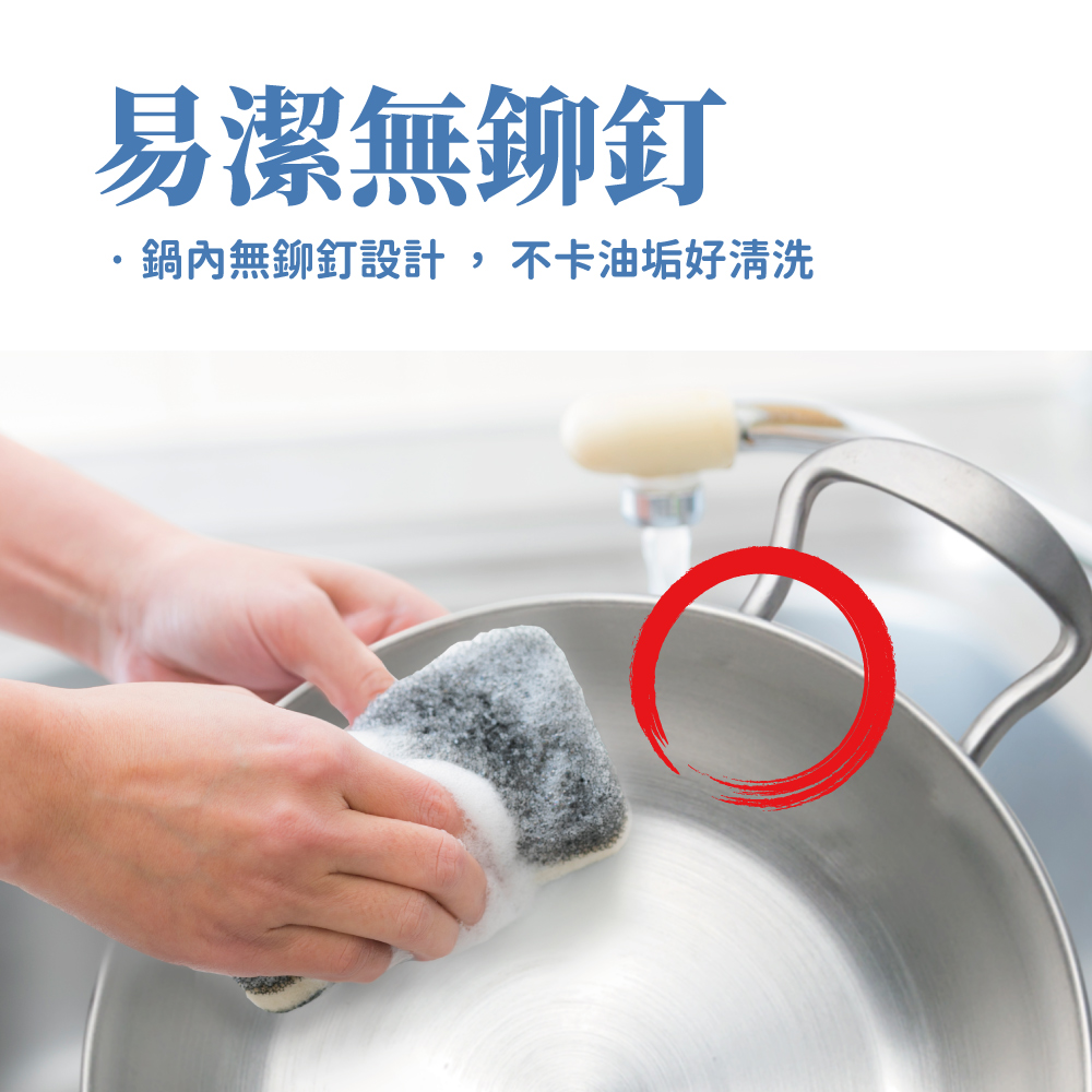 鍋內無鉚釘設計,不卡油垢好清洗