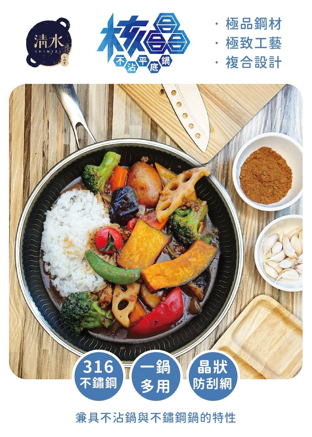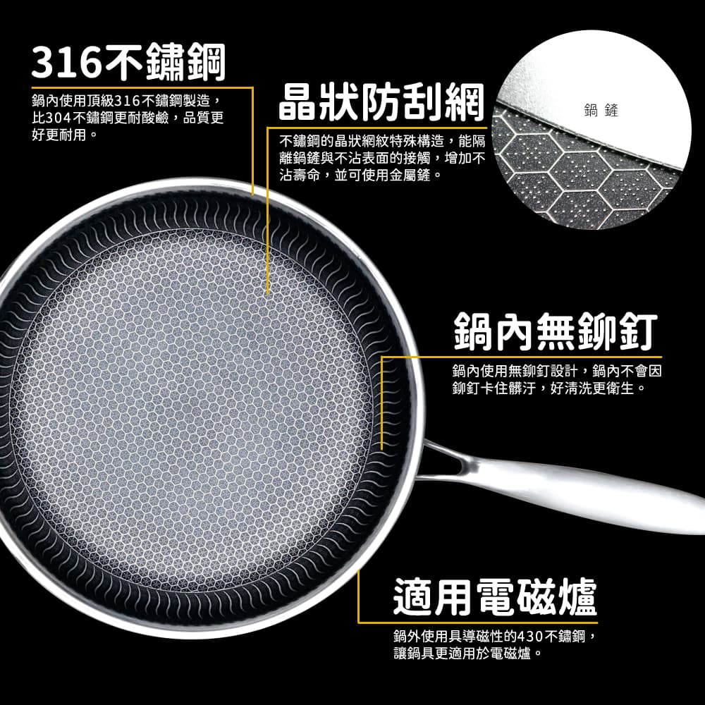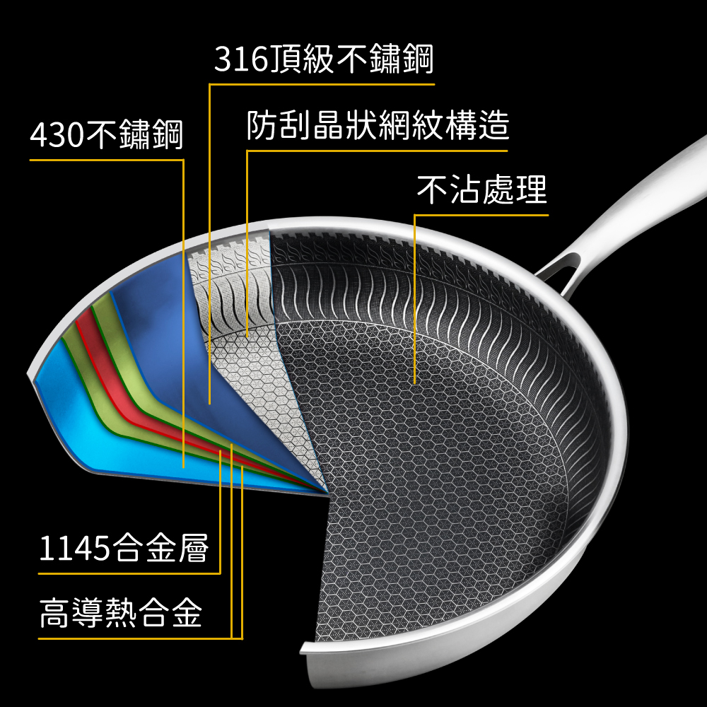 ※獨特晶狀不鏽鋼網,將鍋鏟與不沾塗層隔離,克服一般不沾鍋的弱點,比一般不沾鍋耐刮耐磨。