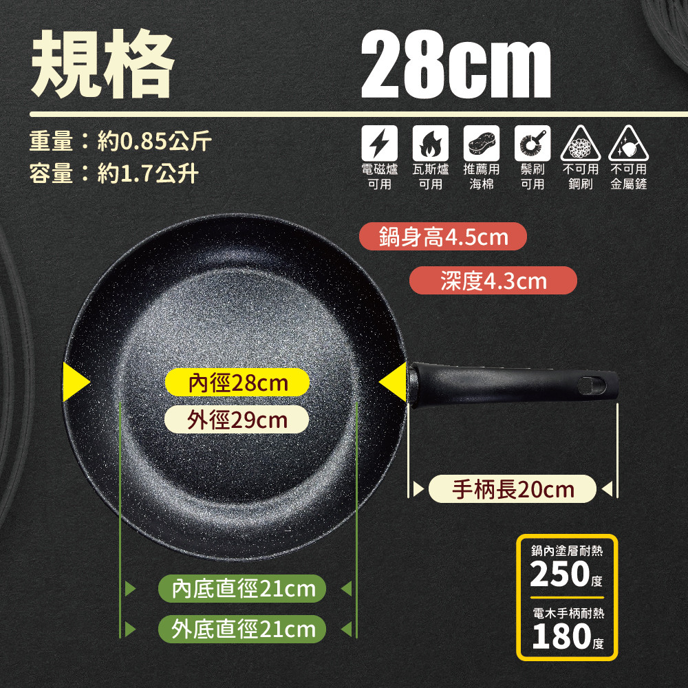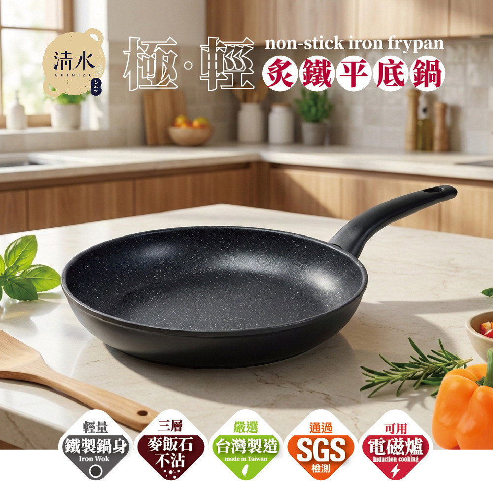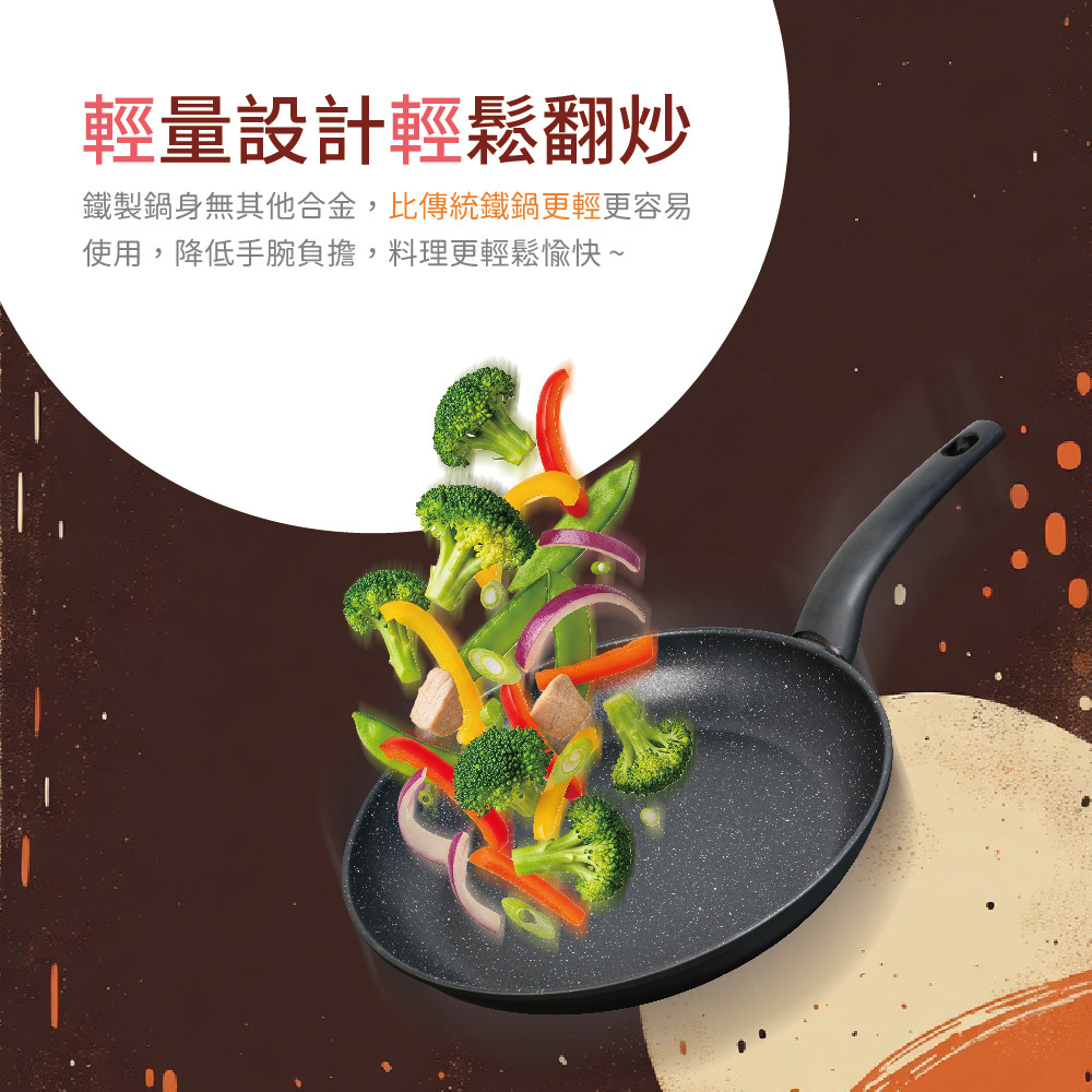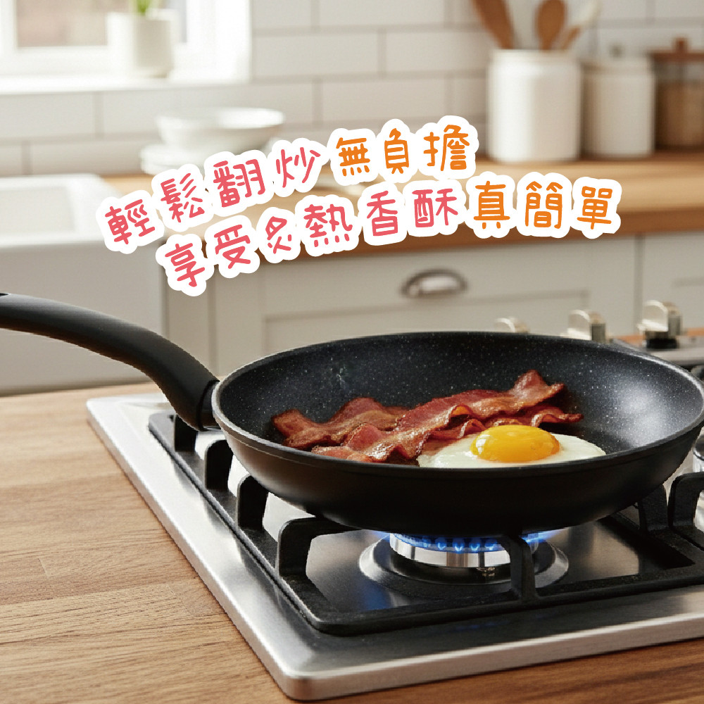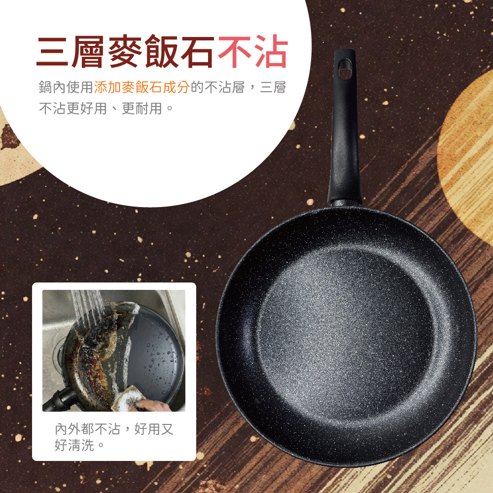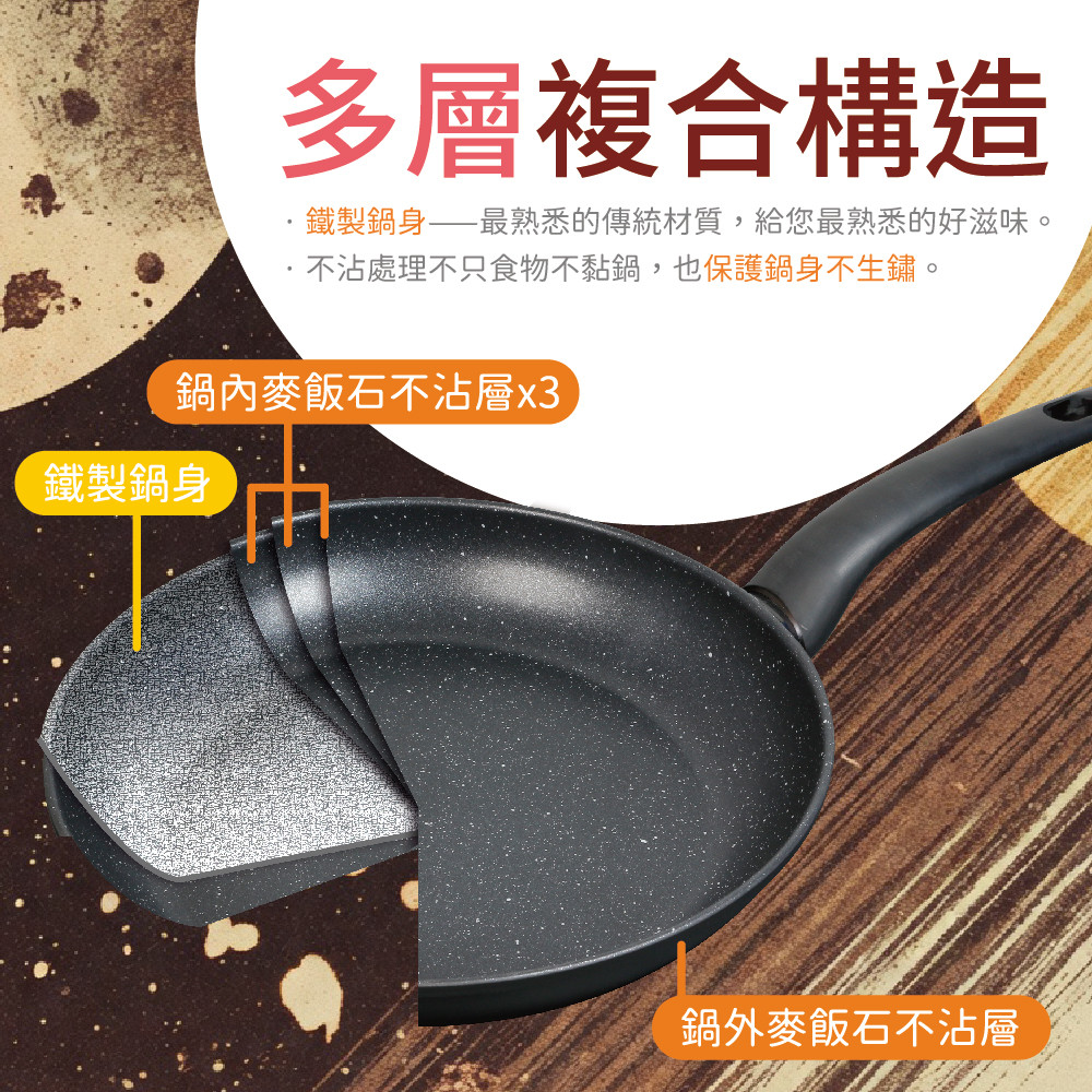※輕量鐵製鍋身,三層麥飯石不沾強化不沾耐用度。