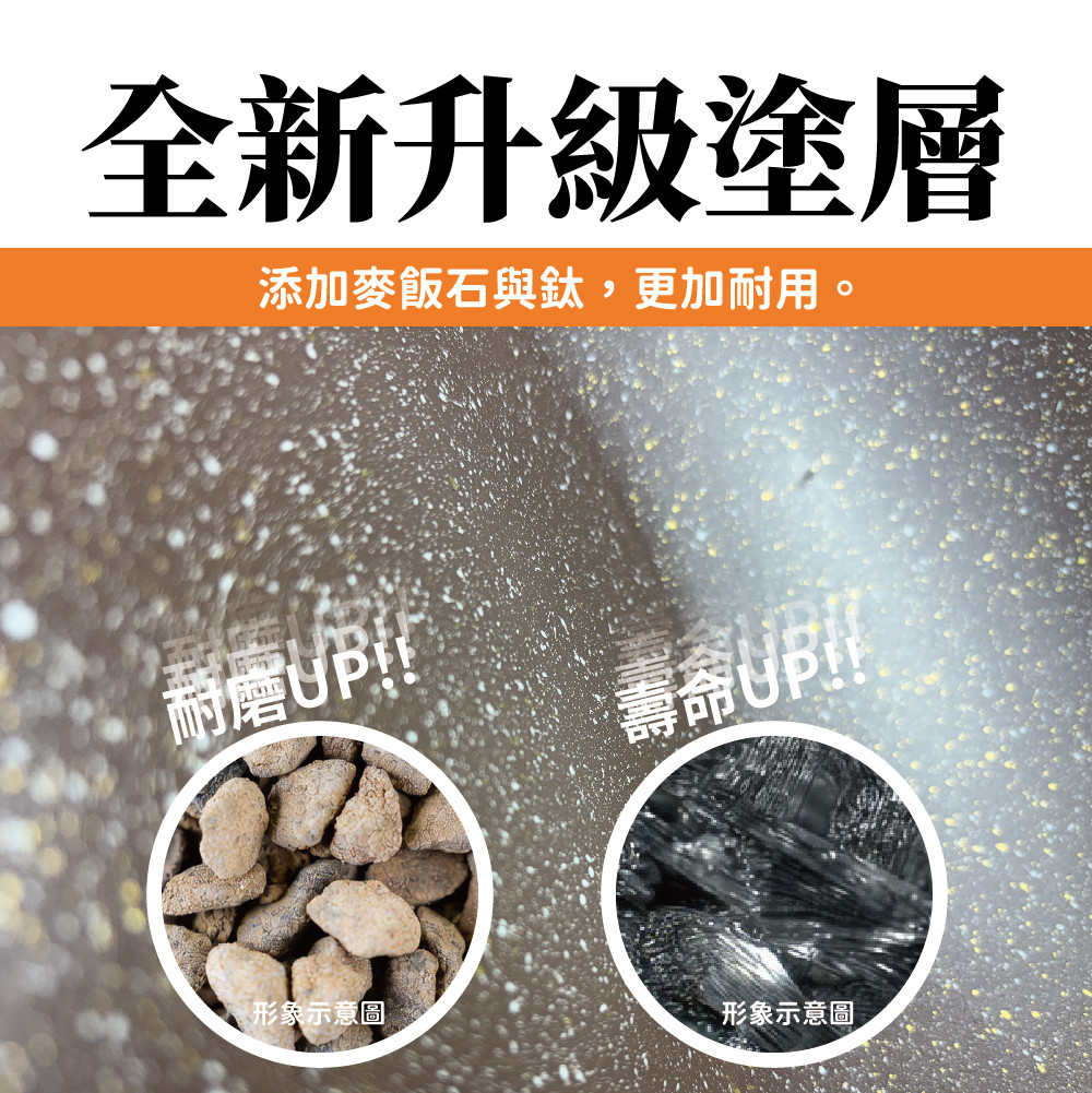 | ◆鍋身材質:鋁合金鍋身、麥飯石鈦不沾處理。 |